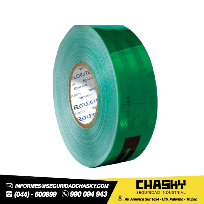 CINTA REFLECTIVA VERDE SELLADA CON LINEAS Y LOGO 5CM(2″) 45.7 MTS
